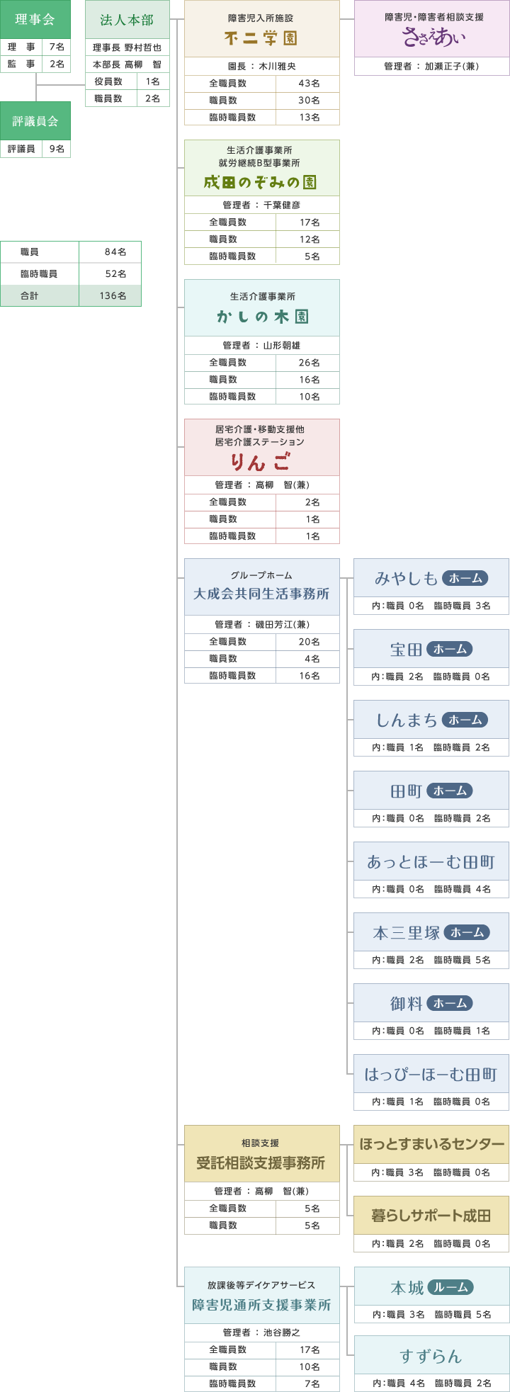 ホーム > 大成会について 役職員 代表者 理事長 野村哲也 役 員 理事:7名/監事:2名 評議員 評議員:9名 委員 評議員選任・解任委員:3名 職 員 職員:84名/臨時職員:52名(計136名) 資産総額 466,909,281円(令和6年3月31日) 組織図